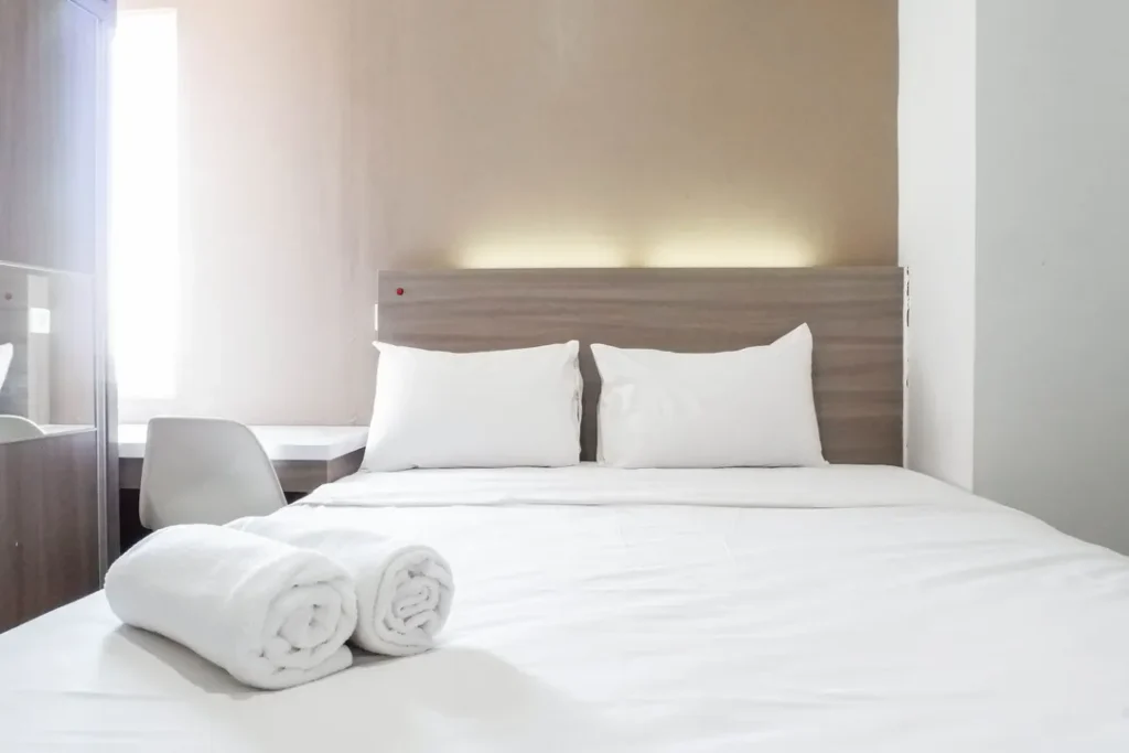 Masuk ke dalam area private, Anda akan disuguhkan dengan desain tata ruang kamar yang menenangkan. Setiap unit di Best Price 2BR with Pool View at Apartment Taman Melati Surabaya By Travelio tidak sekadar menawarkan tempat untuk tidur, melainkan sebuah ruang relaksasi holistik. Penggunaan material sprei premium, kasur berstandar ortopedi, hingga sistem kedap suara yang mumpuni diaplikasikan untuk memastikan kualitas tidur Anda tidak terganggu. Properti ini juga menyediakan berbagai variasi tipe kamar yang bisa disesuaikan dengan budget Anda, mulai dari tipe Premium Deluxe, Junior Suite, hingga Suite Room bagi Anda yang menginginkan keluasan ekstra dan fasilitas lebih mumpuni.