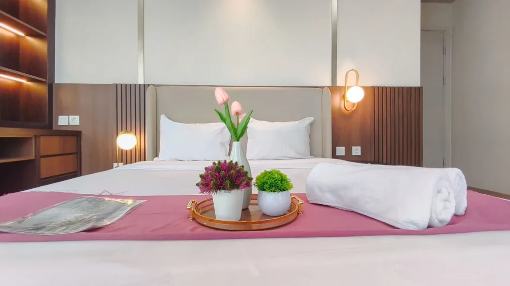 Masuk ke dalam area private, Anda akan disuguhkan dengan desain tata ruang kamar yang menenangkan. Setiap unit di Elegant and Cozy 2BR at Apartment Grand Sungkono Lagoon By Travelio tidak sekadar menawarkan tempat untuk tidur, melainkan sebuah ruang relaksasi holistik. Penggunaan material sprei premium, kasur berstandar ortopedi, hingga sistem kedap suara yang mumpuni diaplikasikan untuk memastikan kualitas tidur Anda tidak terganggu. Properti ini juga menyediakan berbagai variasi tipe kamar yang bisa disesuaikan dengan budget Anda, mulai dari tipe Junior Suite, Luxury Room, hingga Suite Room bagi Anda yang menginginkan keluasan ekstra dan fasilitas lebih mumpuni.
