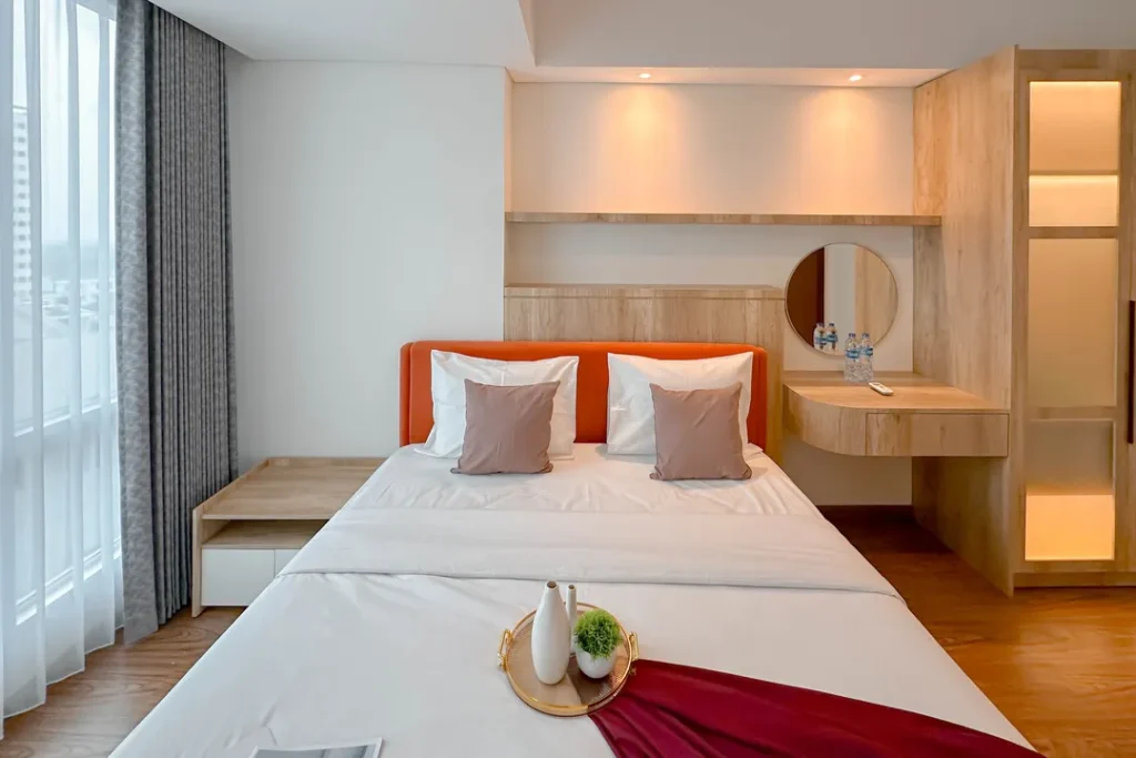 Masuk ke dalam area private, Anda akan disuguhkan dengan desain tata ruang kamar yang menenangkan. Setiap unit di Homey and Cozy 2BR at Grand Sungkono Lagoon Apartment By Travelio tidak sekadar menawarkan tempat untuk tidur, melainkan sebuah ruang relaksasi holistik. Penggunaan material sprei premium, kasur berstandar ortopedi, hingga sistem kedap suara yang mumpuni diaplikasikan untuk memastikan kualitas tidur Anda tidak terganggu. Properti ini juga menyediakan berbagai variasi tipe kamar yang bisa disesuaikan dengan budget Anda, mulai dari tipe Club Room, Junior Suite, hingga Presidential Suite bagi Anda yang menginginkan keluasan ekstra dan fasilitas lebih mumpuni.