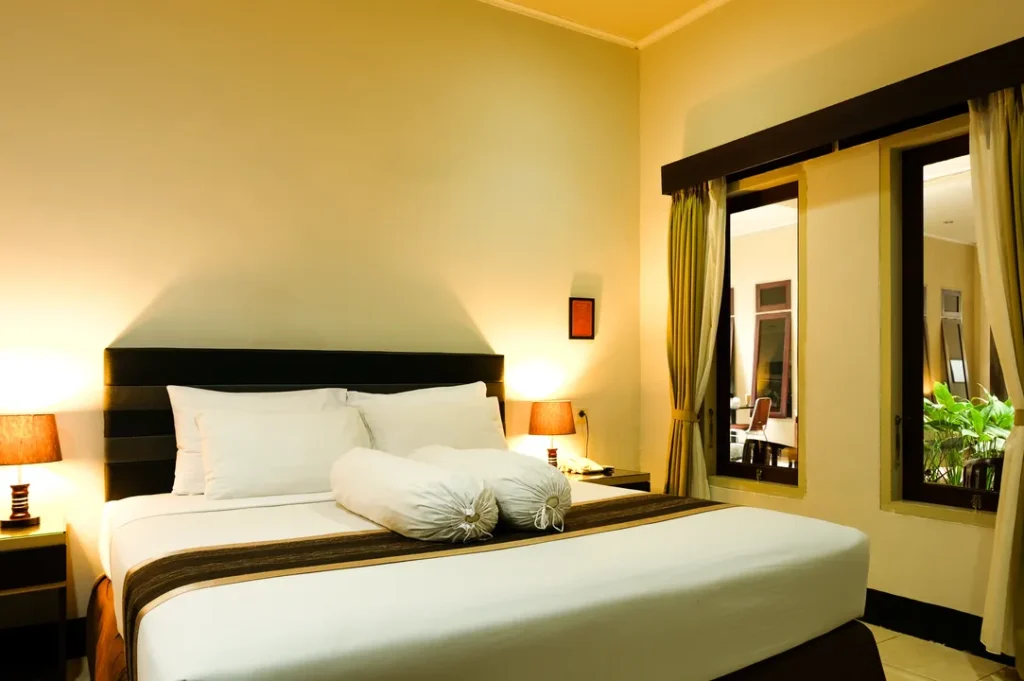 Interior kamar didesain secara cermat memadukan gaya modern dengan pencahayaan yang hangat. Material linen berkualitas dan kasur ergonomis menjamin Anda mendapatkan istirahat yang optimal setelah seharian beraktivitas di luar.