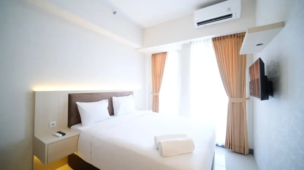 Masuk ke dalam area private, Anda akan disuguhkan dengan desain tata ruang kamar yang menenangkan. Setiap unit di Modern and Nice Studio at Benson Supermall Mansion Apartment By Travelio tidak sekadar menawarkan tempat untuk tidur, melainkan sebuah ruang relaksasi holistik. Penggunaan material sprei premium, kasur berstandar ortopedi, hingga sistem kedap suara yang mumpuni diaplikasikan untuk memastikan kualitas tidur Anda tidak terganggu. Properti ini juga menyediakan berbagai variasi tipe kamar yang bisa disesuaikan dengan budget Anda, mulai dari tipe Suite Room, Presidential Suite, hingga Premium Deluxe bagi Anda yang menginginkan keluasan ekstra dan fasilitas lebih mumpuni.