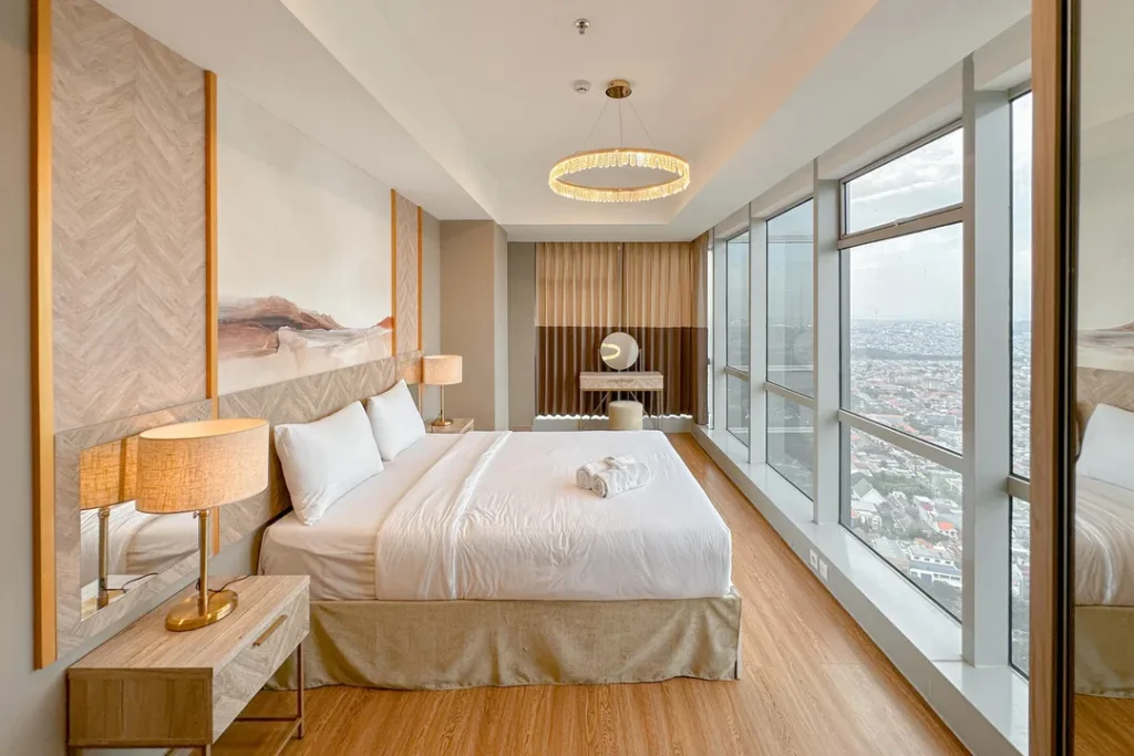 Masuk ke dalam area private, Anda akan disuguhkan dengan desain tata ruang kamar yang menenangkan. Setiap unit di New Contemporary and Nice 2BR at Grand Sungkono Lagoon Apartment By Travelio tidak sekadar menawarkan tempat untuk tidur, melainkan sebuah ruang relaksasi holistik. Penggunaan material sprei premium, kasur berstandar ortopedi, hingga sistem kedap suara yang mumpuni diaplikasikan untuk memastikan kualitas tidur Anda tidak terganggu. Properti ini juga menyediakan berbagai variasi tipe kamar yang bisa disesuaikan dengan budget Anda, mulai dari tipe Premium Deluxe, Executive Suite, hingga Junior Suite bagi Anda yang menginginkan keluasan ekstra dan fasilitas lebih mumpuni.