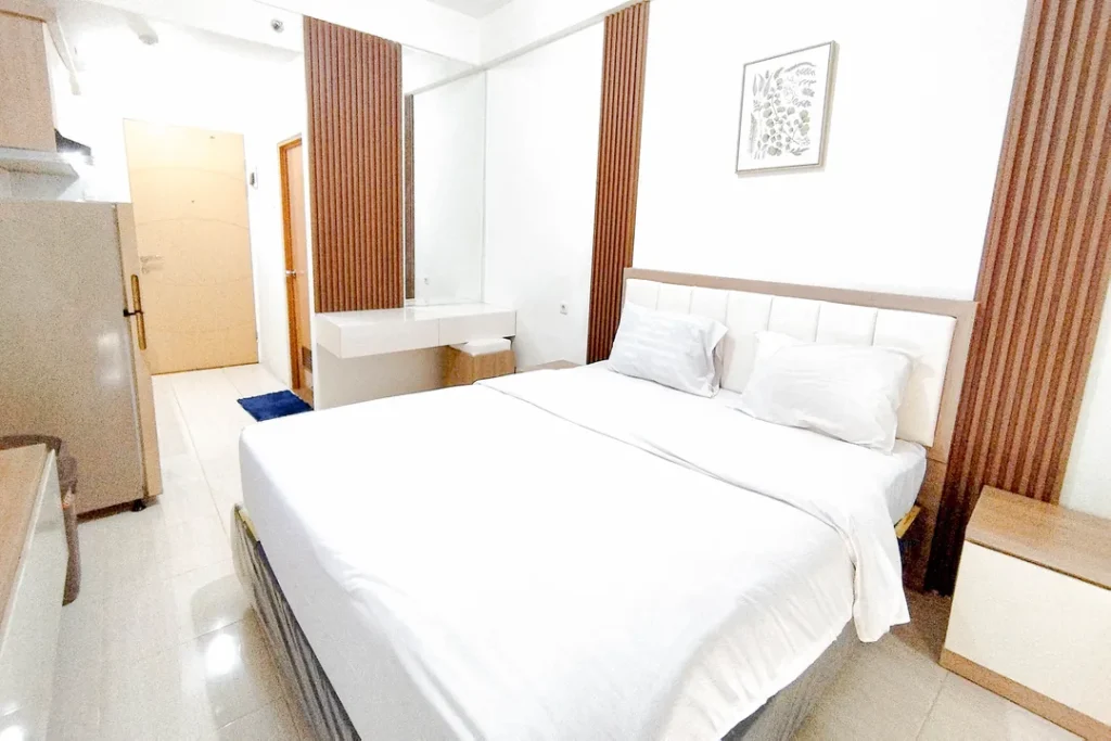 Masuk ke dalam area private, Anda akan disuguhkan dengan desain tata ruang kamar yang menenangkan. Setiap unit di Tranquil Studio Room Apartment at Bale Hinggil By Travelio tidak sekadar menawarkan tempat untuk tidur, melainkan sebuah ruang relaksasi holistik. Penggunaan material sprei premium, kasur berstandar ortopedi, hingga sistem kedap suara yang mumpuni diaplikasikan untuk memastikan kualitas tidur Anda tidak terganggu. Properti ini juga menyediakan berbagai variasi tipe kamar yang bisa disesuaikan dengan budget Anda, mulai dari tipe Executive Room, Premier Room, hingga Superior Double bagi Anda yang menginginkan keluasan ekstra dan fasilitas lebih mumpuni.